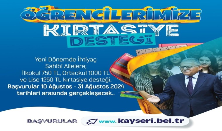 Yardımına ilişkin başlayan başvurular, 10 Ağustos 2024-31 Ağustos 2024 tarihleri arasında Kayseri Büyükşehir Belediyesi’nin internet sitesi www.kayseri.bel.tr adresindeki online hizmetler kısmından ‘kırtasiye yardımı başvuru formu’ üzerinden yapılıyor.