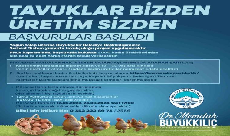 Kırsalda üretim yapan ya da yapmak isteyen kadın vatandaşlara yönelik ‘Kayseri’de Serbest Sistem Yumurta Tavukçuluğu’nun Yaygınlaştırılması Projesi’ çerçevesinde başvurular 12 Ağustos 2024 Pazartesi başladı.