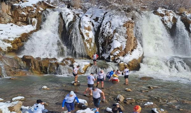 Barış KUL/ERCİŞ (Van), (DHA)- VAN’ın Muradiye ilçesinde bir grup, kentin kış turizmine dikkat çekmek için Muradiye Şelalesi’nin döküldüğü noktada buz gibi suya girip, yüzdü.