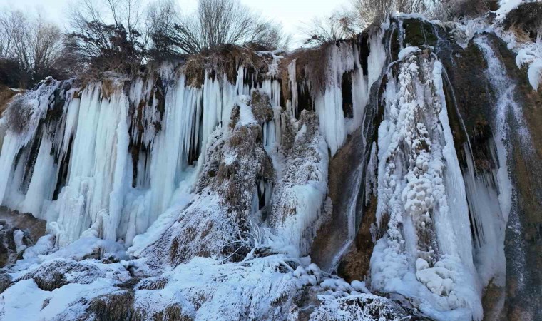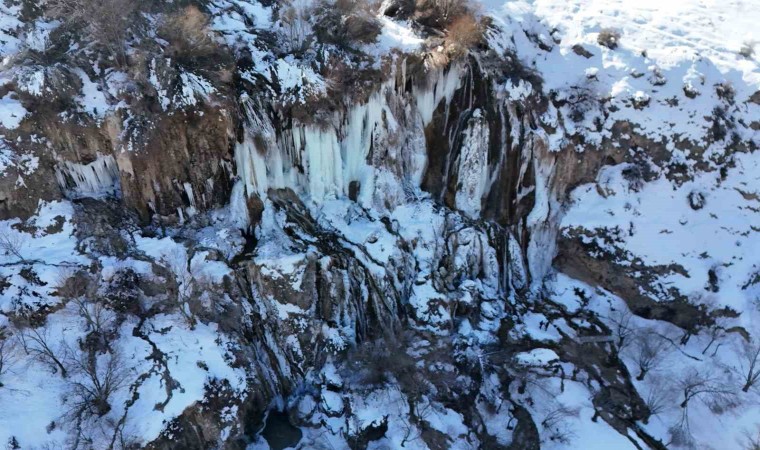 Erzincan’daki Girlevik Şelalesi, kentte etkili olan soğuk havayla birlikte buz tuttu. Şelalede 2 metrelik buz sarkıtları oluştu.