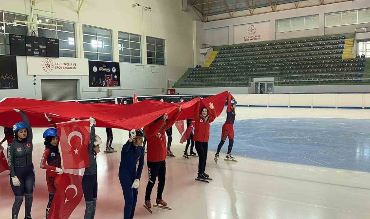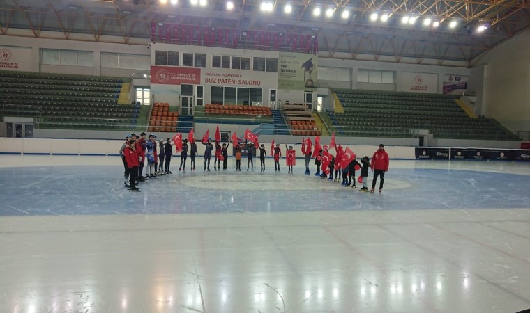 Erzurum’da sürat pateni sporcuları buzda 29 Ekim Cumhuriyet Bayramını kutladı.