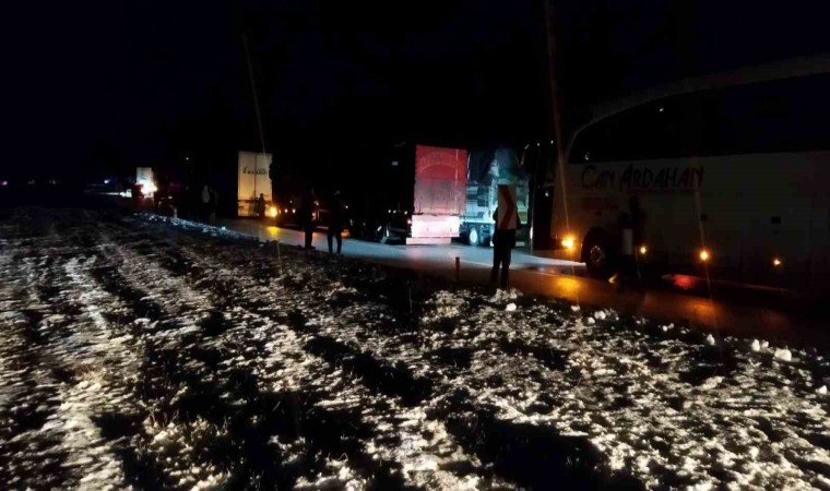 Erzincan’ın yüksek kesimlerinde aralıklı devam eden kar yağışı hayatı olumsuz etkiliyor. Akşam saatlerinden itibaren etkisini artıran kar yağışı ulaşımda aksamalara neden oldu. Erzurum- Erzincan kara yolu kar yağışı ve buzlanma nedeniyle trafiğe kapandı. D100/25 kara yolunun 68. kilometresinde yol dün saat 18.00’da buzlanmadan kaynaklı kazalardan dolayı ulaşıma kapandı. Kazada otomobilde bulunan 6 kişi yaralandı. Kaza yapan araçlar olay yerinden kaldırılamadığı için vatandaşlar saatlerce beklemek zorunda kaldı. Karayolları ekipleri araçları kaldıramayınca büyük vinç beklendi. Kara yolu 00.45’te tamamen açıldı ve bekleyen araçlar gönderildi.