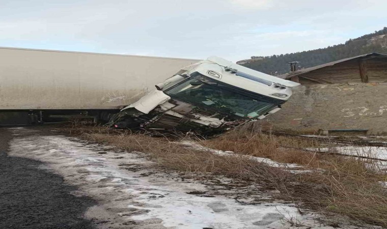 Erzurum-Ardahan karayolunda aşırı buzlanma nedeniyle kayan tır, yol kenarındaki eve çarptı. Kaza nedeniyle yol ulaşıma kapandı.