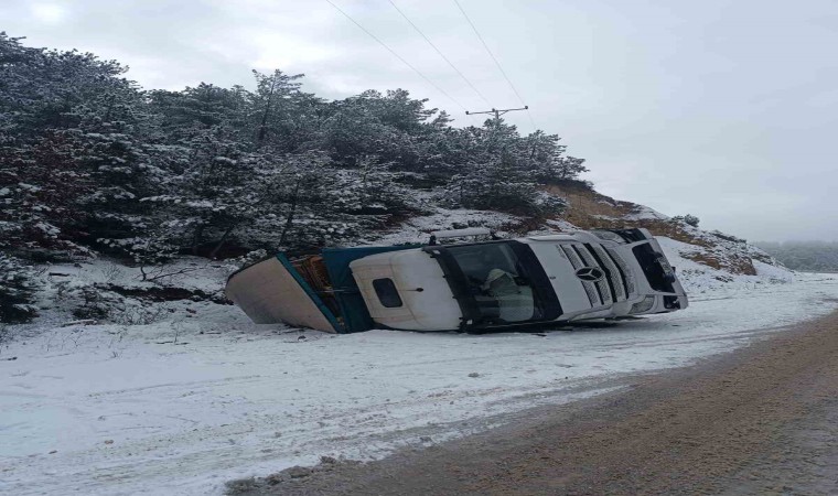 Bolu’nun Göynük ilçesinde canlı tavuk taşıyan kamyon buzlanma sebebiyle kontrolden çıkarak devrildi. Kazada kamyon şoförü hafif yaralandı.