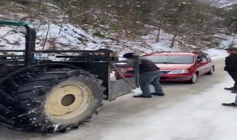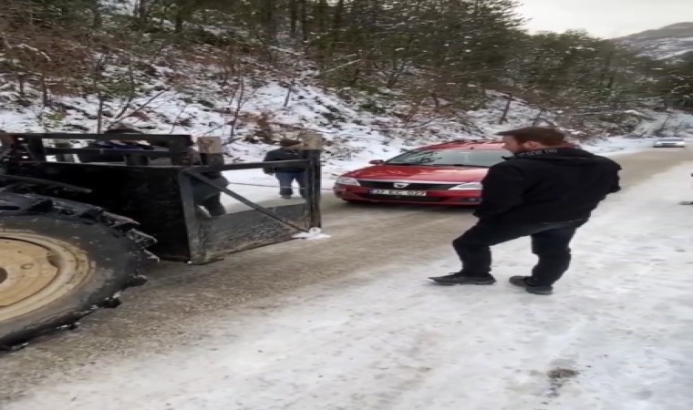 Kastamonu’nun İnebolu ilçesinde buzlanan rampayı çıkamayan araçlar, traktörle çekildi.