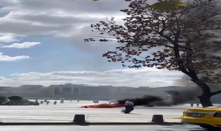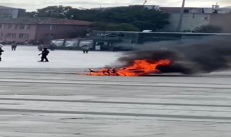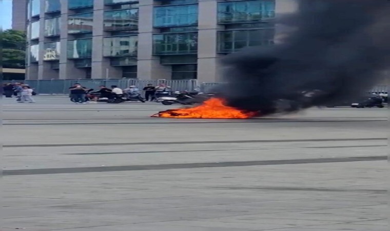 Kağıthane’de Çağlayan Adliye Meydanı’nda bir motosiklet henüz bilinmeyen bir nedenle yanmaya başladı. Bir anda alev topuna dönen motosikletin sürücüsü ise olay yerinden uzaklaşırken, ekipler yangına TOMA ile müdahale etti. O anlar cep telefonu kamerasına böyle yansıdı.