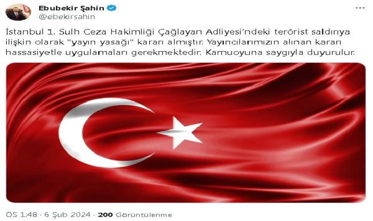 ANKARA, (DHA)- RADYO ve Televizyon Üst Kurulu (RTÜK) Başkanı Ebubekir Şahin, Çağlayan Adliyesi’nde terör saldırısına ilişkin yayın yasağı kararı alındığını açıkladı.