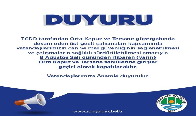 Türkiye Cumhuriyeti Devlet Demiryolları tarafından yapımı devam üst geçit çalışması nedeniyle vatandaşların can güvenliği nedeniyle Orta Kapuz ve Tersane bölgesinde yarından itibaren geçici olarak kapatıldı. Zonguldak Belediyesi tarafından duyuruda, "TCDD tarafından Orta Kapuz ve Tersane güzergahında devam eden üst geçit çalışmaları kapsamında vatandaşlarımızın can ve mal güvenliğinin sağlanabilmesi ve çalışmaların sağlıklı sürdürülebilmesi amacıyla 8 Ağustos Salı gününden itibaren (yarın) Orta Kapuz ve Tersane sahililerine girişler geçici olarak kapatılacaktır.