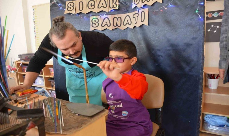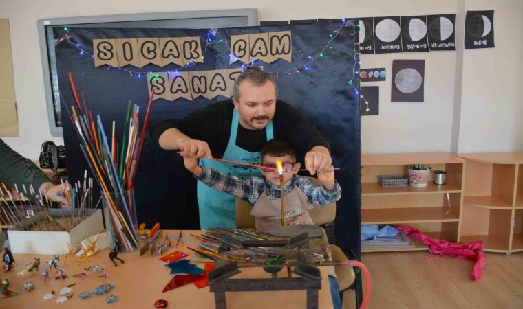 Sorgun Yeşilyurt İlkokulu Anasınıfı Öğretmeni Kübra Şahin’in daveti üzerine ilçeye gelen sıcak cam sanatı usta öğreticisi Tuluğ Sepet, anaokulu öğrencilerinin hayallerini camla buluşturdu. Atölye ortamında sıcak cam sanatının inceliklerini öğrencilere aktaran Sepet, 6 yaşında babasından öğrendiği bu sanatı çocukların erken yaşta öğrenmesi için çalıştığını söyledi.