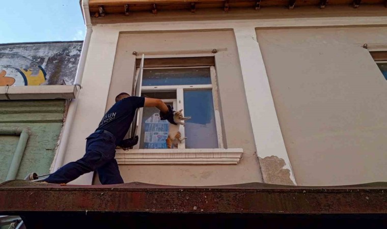Samsun’un Bafra ilçesinde yarı açık pencerede sıkışan kedi, itfaiye ekipleri tarafından kurtarıldı.
