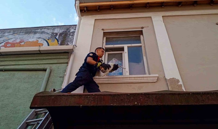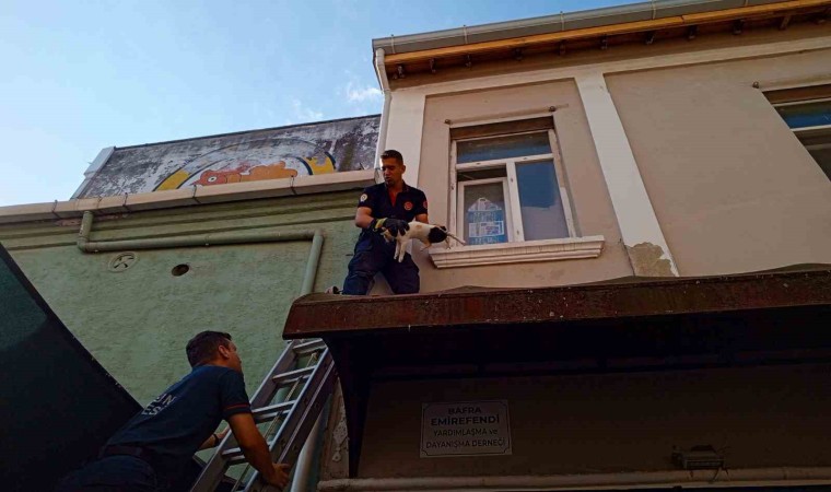 Cumhuriyet Meydanı Uncular Geçidi Sokak’ta 2 katlı kullanılmayan binanın 2. katında yarı açık pencerede bir kedinin sıkıştığını gören vatandaşlar, itfaiyeyi arayarak yardım istedi. Olay yerine gelen Büyükşehir Belediyesi itfaiye ekipleri ayağı sıkışan kediyi kurtarmak için çalışma başlattı. Merdivenle kedinin bulunduğu yere çıkan itfaiye eri, kediyi kurtararak aşağı indirdi. Bir kutuya konulan kedi ayağının tedavisi yapılmak üzere götürüldü.