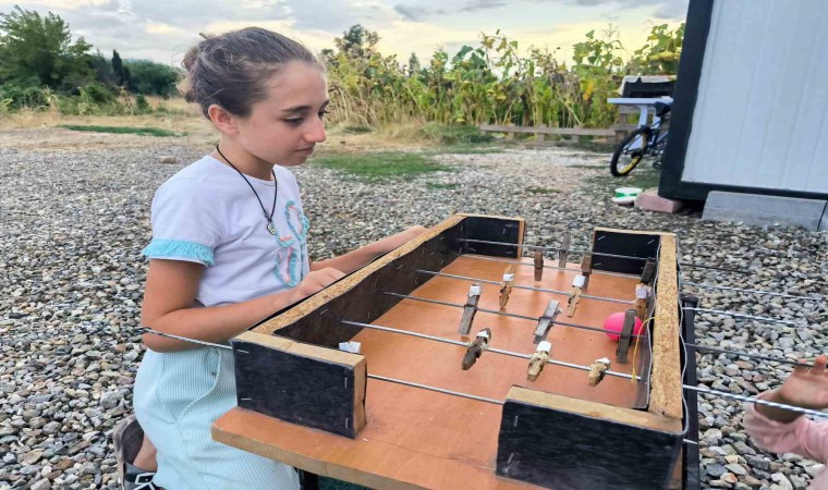 11 yaşındaki Eylül Demirci, "6. sınıfa gidiyorum depremden dolayı konteynerde yaşamaya başladık. Yaz tatilimi kitap okuyarak, kursa giderek ve bir şeyler üreterek geçirdim. Ürettiklerimden biri de langırt. Langırtı nasıl yaptım diye sorarsanız büyüklerimin de yardımıyla çamaşır mandalı, kebap şişleri ve tahta kullandım yaptım. Yaz tatilimi kardeşlerim ile langırt oynayarak geçirdik" diye konuştu.