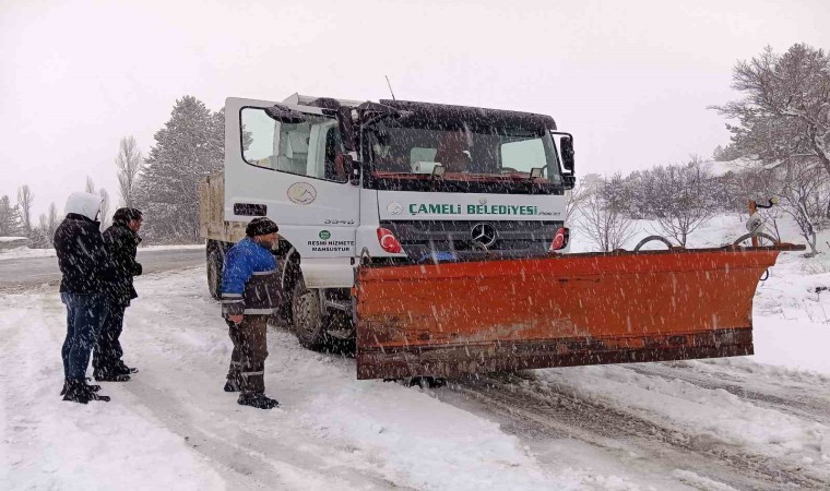 Çameli Belediyesi Fen İşleri Müdürlüğü ekipleri, yoğun kar yağışı nedeniyle ulaşımda zaman zaman aksamaların yaşandığı kırsal mahallelerde mesaisine ara vermeden devam ediyor.