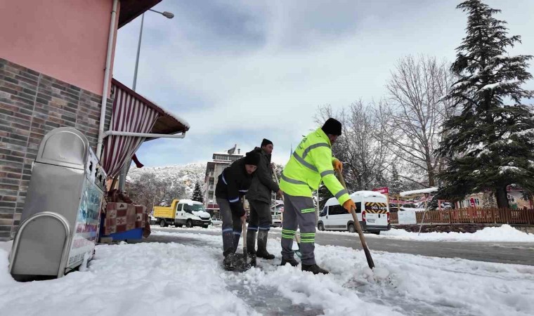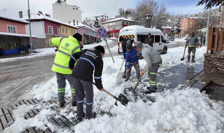 Denizli’de yoğun kar yağışının etkili olduğu Çameli ilçesinde, belediye ekipleri kırsa mahallelerdeki yol açma çalışmalarının ardından ilçe merkezindeki yol ve kaldırımları da güvenli hale getirdi.