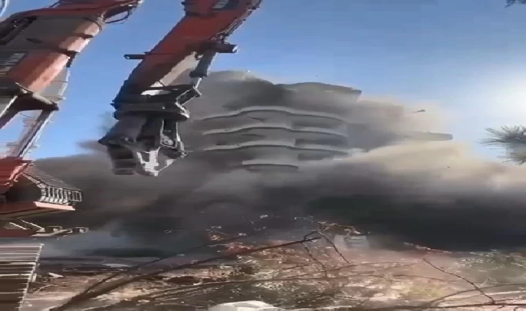 Yıkım kararı verilen ağır hasarlı 2 binada, kontrollü yıkım çalışması başlatıldı. Çalışmada binalar, yıkım sırasında çöktü. Çökmeyle çevreyi toz bulutu kaplarken, o anlar cep telefonu kamerasına yansıdı. (DHA)
