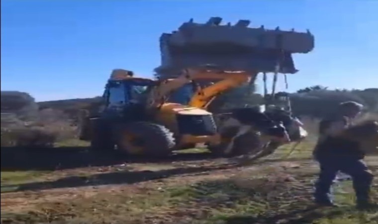 Muğla’nın Datça ilçesinde çamura saplanarak derede mahsur kalan bir inek iş makinesiyle kurtarılırken, buzağısı bir an yanından ayrılmadı.