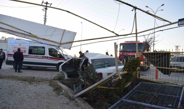 Karaman’da hafif ticari araçla otomobilin çarpıştığı kazada can pazarı yaşandı. Çarpışmanın şiddetiyle savrulan otomobil yol kenarındaki fidan satışı yapan iş yerine dalarken, o anlar kameraya yansıdı.