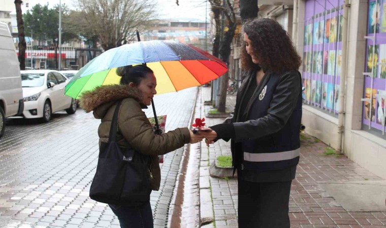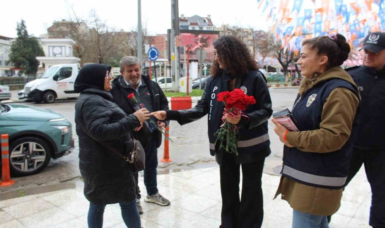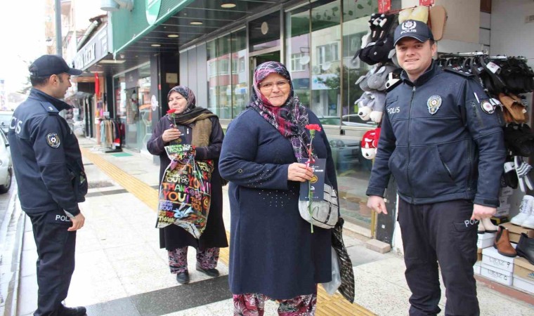 Çanakkale’nin Çan ilçesinde polis ekipleri kadınlara karanfil dağıttı.