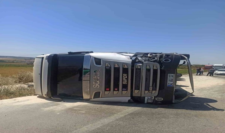 Çanakkale-Bursa karayolunda kamyona çarpan tır yan yattı. Kazada 1 kişi yaralandı.