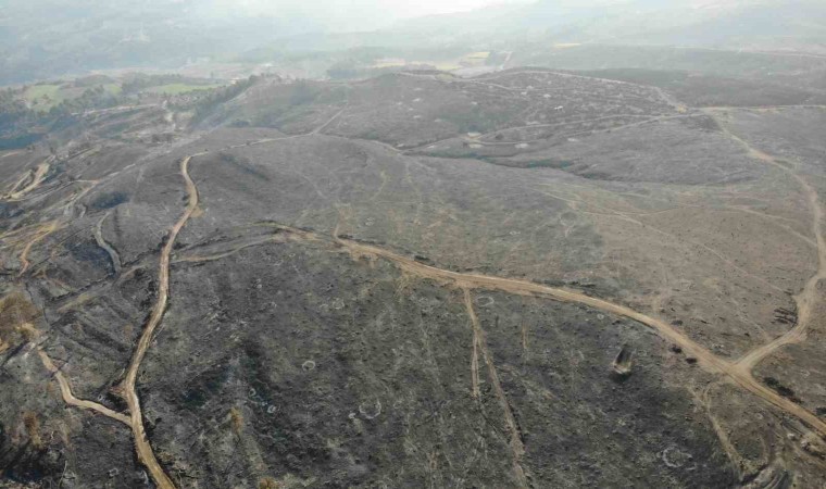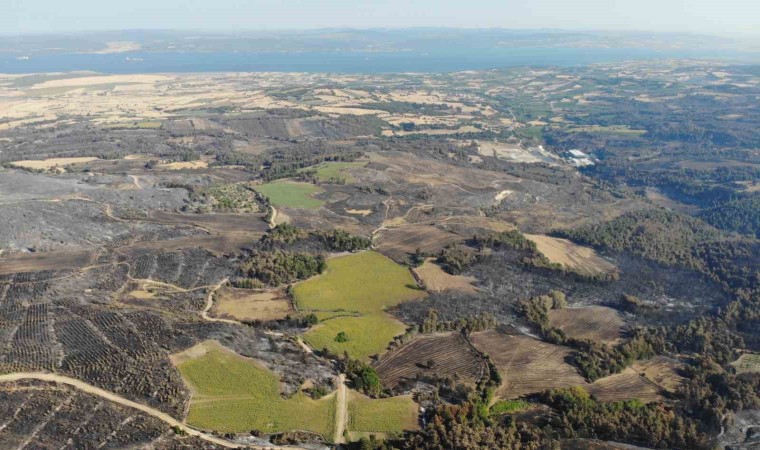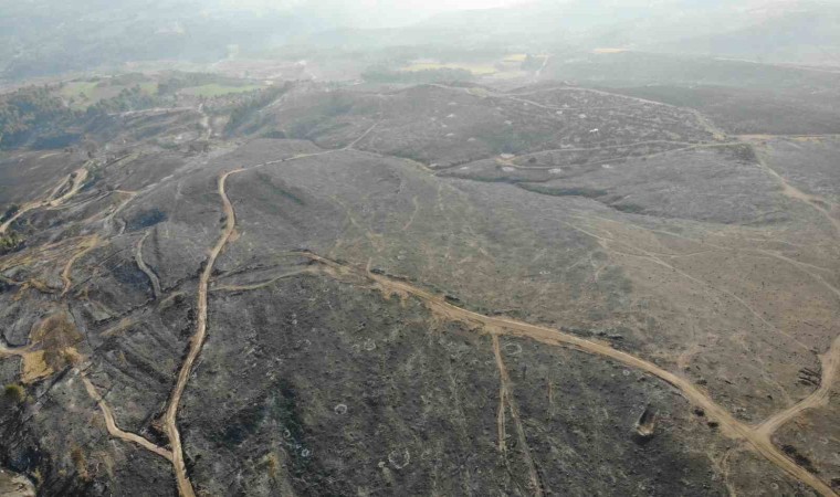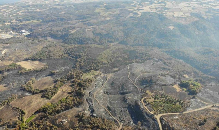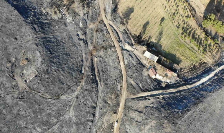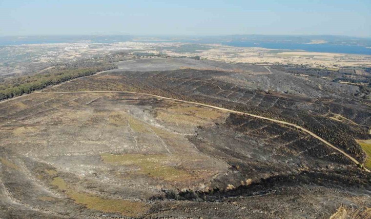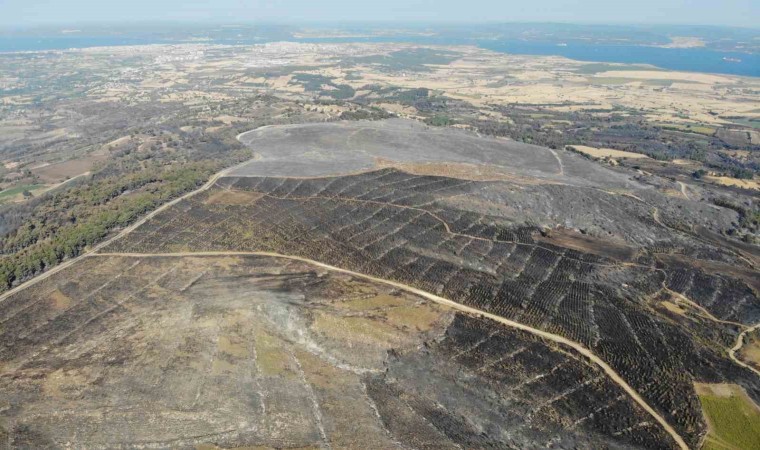 Çanakkale merkeze bağlı Kızılkeçili köyünde 16 Temmuz Pazar günü çıkan ve dün kontrol altına alınan orman yangını sonrası yanan alanlar dron ile görüntülendi.