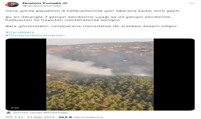 Tarım ve Orman Bakanı İbrahim Yumaklı, Çanakkale'deki orman yangınına ilişkin sosyal medya hesabından yaptığı açıklamada, "Gece görev yapabilen 4 helikopterimiz gün ağarana kadar sorti yaptı. Şu an itibarıyla 7 yangın söndürme uçağı ve 22 yangın söndürme helikopteri ile havadan müdahalemiz sürüyor. Kara gücümüzün cansiparane mücadelesi de aralıksız devam ediyor" dedi.