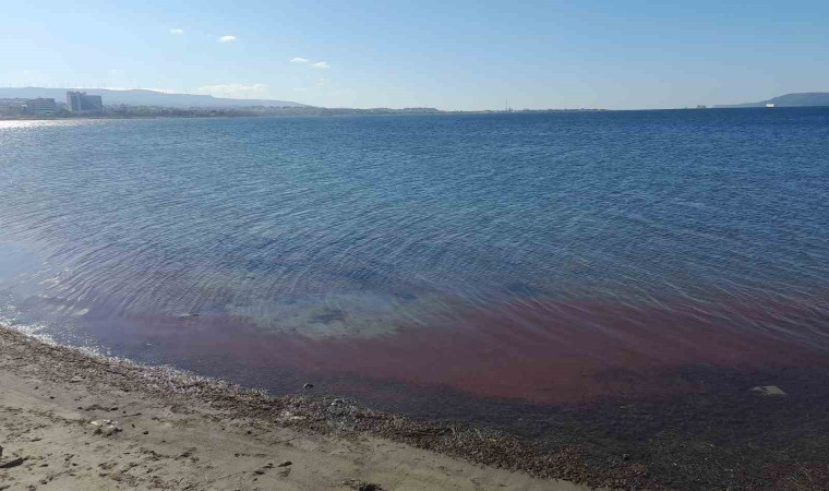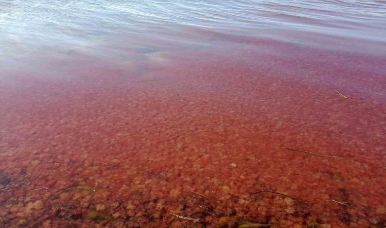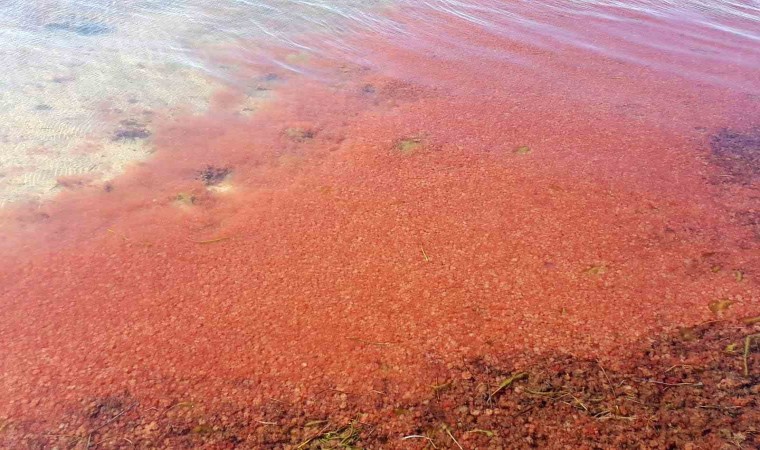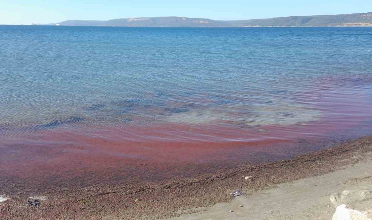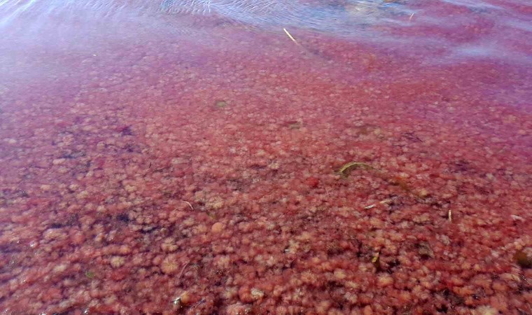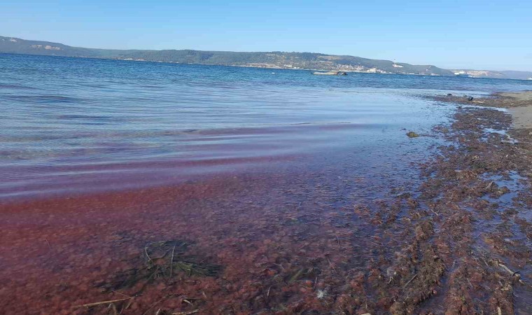 Çanakkale’de etkili olan lodos, sahile kırmızı yosun getirdi. Sahil kesimi yosunlarla birlikte adeta kızıla boyandı.