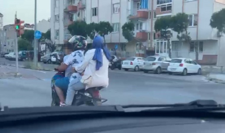Çanakkale’de iki kişilik motosiklete 2’si çocuk 4 kişi bindi. Troya Caddesi üzerinde 2 kişilik motosiklete 2’si çocuk 1’i kadın 4 kişinin binmesi görenleri hayrete düşürdü. Motosiklete binen 4 kişiden sadece motosiklet sürücüsünde kask olması dikkat çekti. Çocuklardan biri sürücünün önüne ayakta dururken, diğer çocuğun ise erkek ile kadının arasında koltukta oturarak gittiği görüldü. Tehlike dolu anlar cep telefonu kamerasına yansıdı. Motosikletteki 4 kişi hiçbir şeye aldırmadan yollarına devam etti.