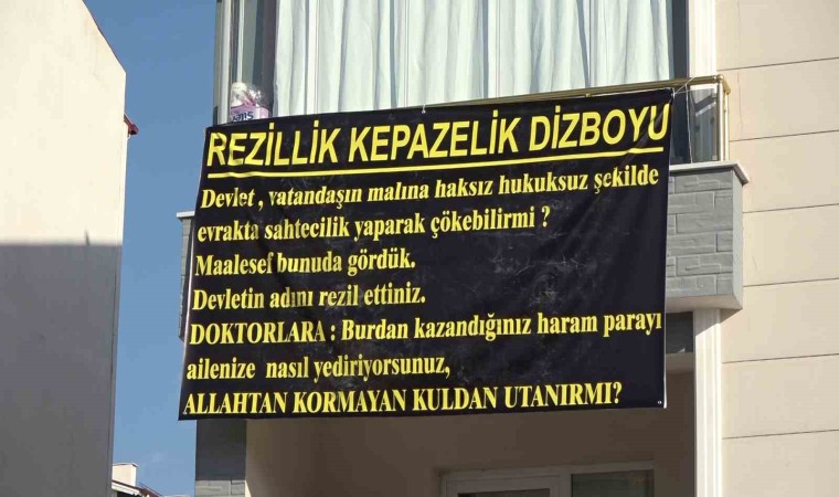 Gurbetçi Veli Uzun, kent merkezi Şeyhşamil Mahallesi’nde bulunan dükkanını 2018 yılında İl Sağlık Müdürlüğüne Aile Sağlık Merkezi olarak kullanılması için kiraladı. 250 metrekare olan dükkanı için İl Sağlık Müdürlüğüyle bir yıllığına anlaştı. 1 yıllık sözleşmenin dolmasına rağmen doktorlar dükkandan çıkmadı. Karşılıklı olarak sözleşmenin feshedilmesine rağmen kira alacağını da tahsis edemeyen Uzun, mahkemeye başvurdu. 2 yıl süren mahkemenin ardından tahliye kararı çıktı. Doktorlar bu karara da uymazken, durum istinaf mahkemesine taşındı. İstinaf mahkemesinin doktorların lehine karar vermesi üzerine çaresiz kalan Uzun, sesini apartmana astığı pankartlarla duyurmaya çalıştı. Astığı pankarta, “Rezillik kepazelik diz boyu. Devlet, vatandaşın malına haksız hukuksuz şekilde evrakta sahtecilik yaparak çökebilir mi? Maalesef bunu da gördük. Doktorlara: Buradan kazandığınız haram parayı ailenize nasıl yediriyorsunuz, Allah’tan korkmayan kuldan utanır mı?” yazarak duruma adeta isyan etti. Çaresiz kalan Uzun, sorunun biran önce çözülmesini istiyor.