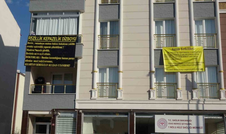 Sivas’ta doktorlara kiraladığı dükkanını geri alamayan mal sahibi, apartmana astığı pankartlarla adeta isyan etti.
