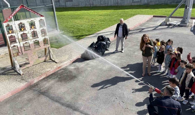Çankırı’da öğrenciler, itfaiye binasını ziyaret ederek hem itfaiyenin çalışmaları hakkında bilgi aldı hem de yapay maketlere su sıktı.