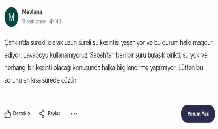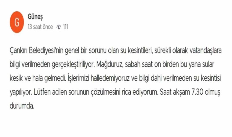 Son olarak dün yaşanan su kesintisi ile ilgili Çankırı Belediyesi’nin sosyal medya hesaplarından yapılan açıklamada, “Ana beslenme hattımızda sabah saatlerinde çıkan ani arıza nedeni ile Aksu Mahallesi alt kesimleri, Yeni Mahalle alt kesimleri, A.H.R. Mahallesi Yanlar Caddesi Küçük Sanayi ve Göç İdaresine kadar olan yerlerin suları kesilmiştir. Ekiplerimiz, arızanın giderilmesi ve suların tekrar verilebilmesi için çalışmalarına devam etmektedir” ifadelerine yer verildi.