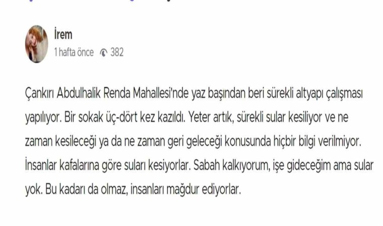 Çankırı il merkezinde son bir haftadır sürekli olarak yaşanan su kesintileri tepkiye sebep oldu. Son olarak Abdulhalik Renda Mahallesi Yanlar Caddesi, Küçük Sanayi ve İl Göç İdaresi’ne kadar olan bölgedeki evlere su verilemedi. Yaşanan su kesintileri için vatandaşlar sosyal medyadan tepki gösterdi. Sürekli olarak kentte su kesintilerinin yaşandığını ve herhangi bir bilgilendirme yapılmadığını söyleyen vatandaşlar, mağdur olduklarını söyleyerek Çankırı Belediyesi’ne tepki gösterdi.