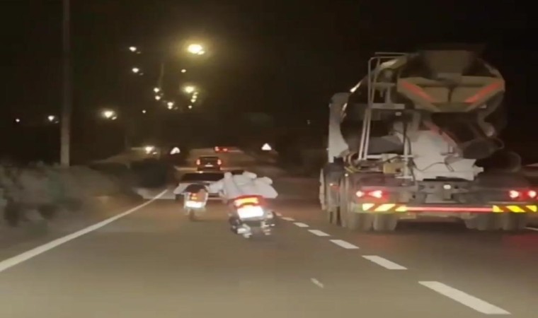 Torba Kavşağı’ndan Bodrum merkezine doğru giden ana yolda iki motosikletli genç, hızla ilerleyen araçların yanından motosikletlerinin üzerine yatarak sürüş yapmaya başladı. Süratli bir şekilde motosikletlerle akrobasi hareketi yapan gençler ağır vasıta araçlara da aldırış etmeden hem trafiği hem de kendi canlarını tehlikeye attı. Adeta ölümle dans eden gençlerin yaptığı hareketler yürekleri ağızlara getirdi.