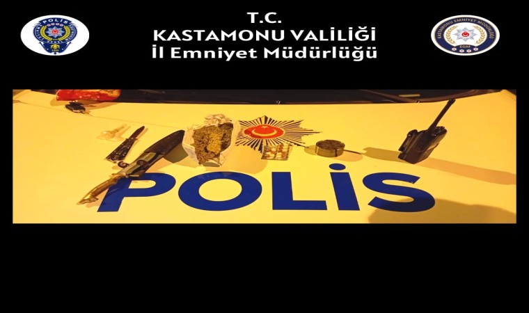Edinilen bilgiye göre, Kastamonu İl Emniyet Müdürlüğü Asayiş Şube Müdürlüğü ekiplerinin yaptığı kontroller sırasında elindeki çantayı atıp kaçmaya çalışırken yakalanan T.S.B.’nin çantasından 80 gram kannabinoid maddesi, 8 adet sentetik ecza hapı, 1 adet uyuşturucu içiminde kullanılan cam düzenek (bong), 1 adet uyuşturucu içiminde kullanılan değirmen ve 2 adet bıçak ele geçirildi.
