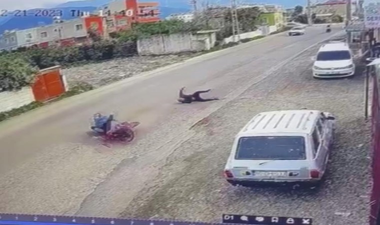 Hatay’ın Dörtyol ilçesinde meydana gelen kazada, motosiklet sürücüsünün ve çarptığı yayanın havaya uçma anı kameraya yansıdı.
