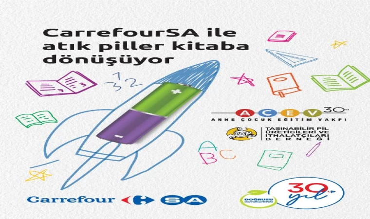 Bu yıl 30’uncu yaşını kutlayan CarrefourSA, yine bu yıl 30’uncu yaşını kutlayan Anne Çocuk Eğitim Vakfı (AÇEV) tarafından geliştirilen ‘Okuyan Bir Gelecek’ projesi kapsamında mağazalarında topladığı atık pillerle ihtiyaç sahibi çocukların gelişimlerine destek olmayı hedefliyor. CarrefourSA CEO’su Kutay Kartallıoğlu, "2022 yılında başladığımız ve hala devam eden, TAP (Taşınabilir Pil Üreticileri Derneği) ve AÇEV iş birliğimiz ile müşterilerimizin de katkılarıyla 650 kg atık pil topladık. Topladığımız atık pillerin kitaba dönüşmesi ile AÇEV’in ihtiyaç sahibi çocuklara ulaşmasına destek oluyoruz" dedi.