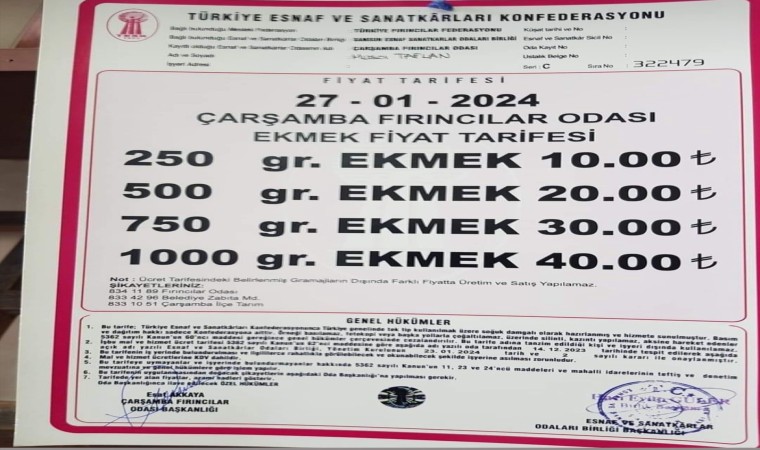 Yeni yıl ile birlikte bir süredir gündemde olan ekmek fiyatlarının güncellemesi Çarşamba’da da yapıldı. Fırıncıların zam talebi üzerine Çarşamba Fırıncılar Odası tarafından 7,5 liradan satılan 230 gram ekmeğin gramajı 250 grama, fiyatı da 10 TL’ye yükseltildi. YYapılan zam ile 27 Ocak’tan itibaren geçerli olan fiyat tarifesi ile birlikte 250 gram ekmek 10 TL olarak belirlenirken, 500 gram ekmeğin fiyatı 20 TL, 750 gram ekmeğin fiyatı 30 TL ve 1000 gram ekmeğin fiyatı 40 TL olarak belirlendi.