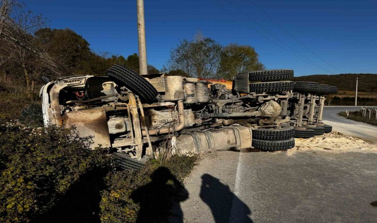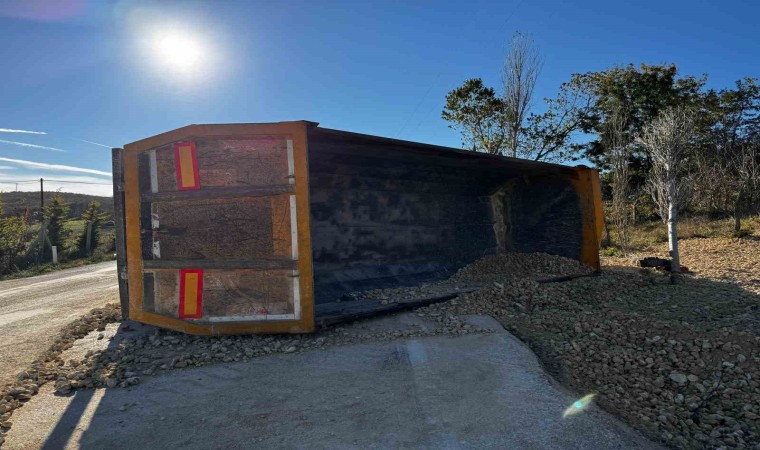 İstanbul Çatalca’da virajı alamayarak devrilen kum yüklü hafriyat kamyonunun sürücüsü ağır yaralandı.