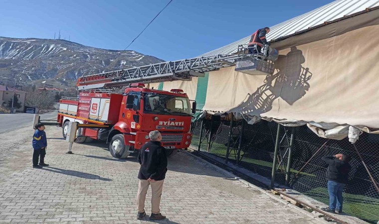Malatya’nın Darende ilçesinde halı sahanın çatısına sıkışarak mahsur kalan kedi, bir çocuğun ihbarı ile itfaiye tarafından kurtarıldı.