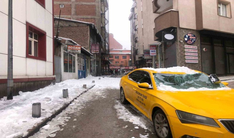 Erzurum’da etkili olan kar yağışı sonrası çatılarda oluşan dev buz sarkıtları ve öğle saatlerinde düşen dev kar kütleleri araç ve yayalar için büyük bir tehlike oluşturuyor.