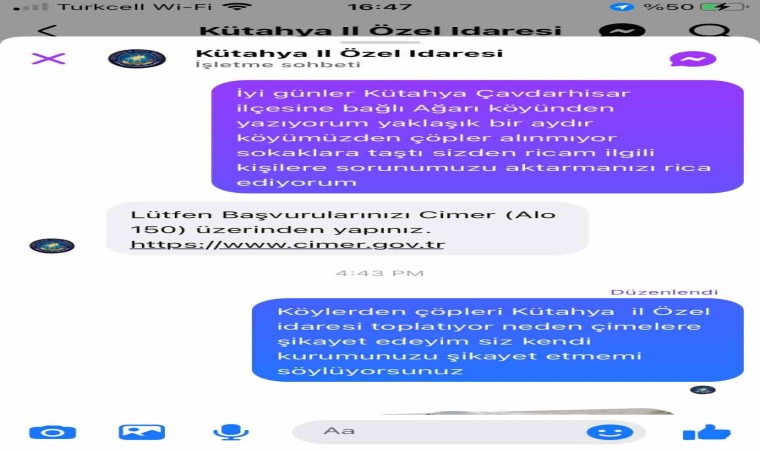 Çöp problemini Kütahya İl Özel İdaresi Genel Sekreterliğini sosyal medya üzerinden bildirdiğini fakat, "Şikayetlerinizi Cimer’e (Alo 150) yapınız" şeklinde bir cevap aldığını dile getirdi.
