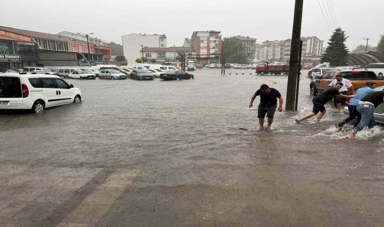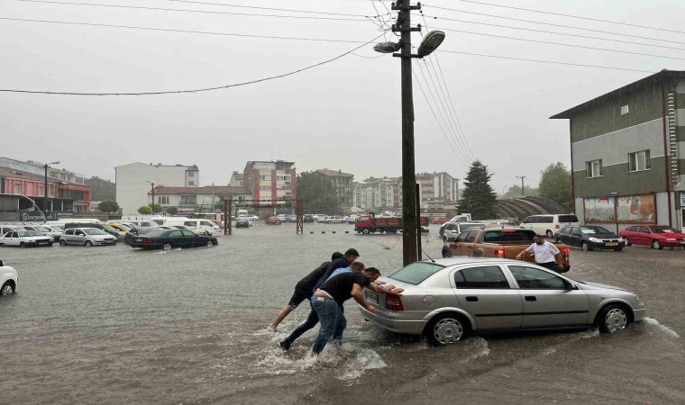 Batı Karadeniz Bölgesi’ni etkisi altına alan şiddetli sağanak yağışlar, Çaycuma ilçesinde hayatı olumsuz etkiledi. İlçenin İstasyon Mahallesi’nde bulunan şehirlerarası otobüs terminali ve çevresindeki galerici esnafının bulunduğu bölge, yoğun yağışların ardından su baskınına uğradı.