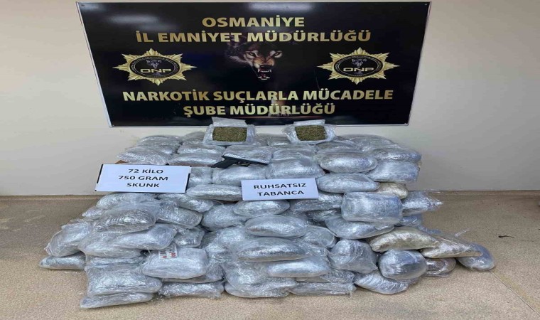 Osmaniye İl Emniyet Müdürlüğü ekipleri, uyuşturucu satıcılarına yönelik düzenlediği operasyonda, çekici üzerinde bulunan otomobilde hassas burunlu narkotik köpeği ile yapılan aramada 75 kilo 750 gram skunk ve 1 ruhsatsız tabanca ele geçirildi. Şüpheli T.B., F.B., F.İ. ve H.Y. gözaltına alındı. Olayla ilgili soruşturma sürüyor.