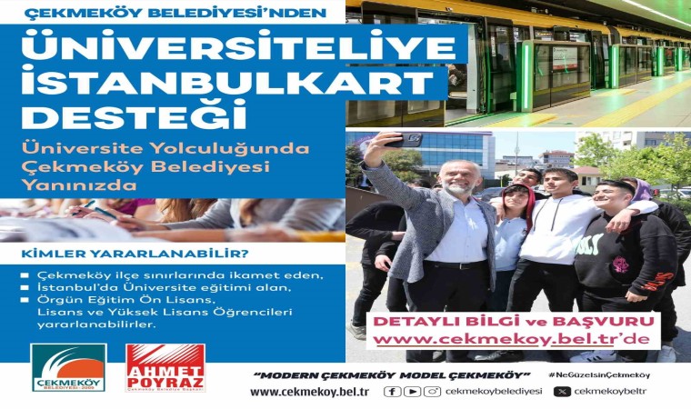 Çekmeköy Belediye Başkanı Ahmet Poyraz, “Gençlerimizden gelen talepler doğrultusunda üniversite öğrencilerimize ulaşım desteğini hayata geçiriyoruz. Bu projemiz ile akademik yıl boyunca ön lisans, lisans ve yüksek lisans eğitim alan öğrencilerimizin İstanbulkart aylık abonman ücretini Çekmeköy Belediyesi olarak karşılıyoruz. Eğitim alanındaki destekleri önümüzdeki yıllarda da sürdürmeye devam edeceğiz. Ulaşım desteğimizin öğrencilerimize hayırlı ve uğurlu olmasını diliyorum” dedi.