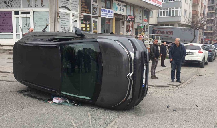 Tekirdağ Çerkezköy’de iki aracın çarpıştığı kazada, otomobillerden biri çarpmanın etkisiyle yan yattı.