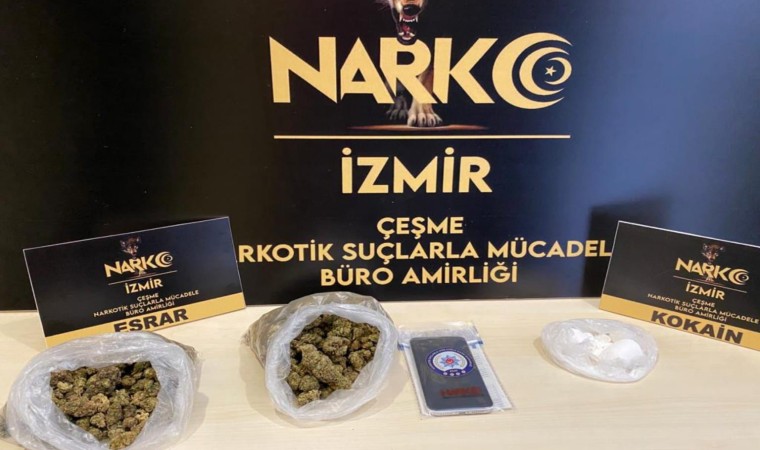Edinilen bilgiye göre, Çeşme Narkotik Büro Amirliği ve Çeşme İlçe Emniyet Müdürlüğü ekipleri, yapılan çalışma sonucunda bir araç ile bir eve operasyon gerçekleştirdi. Araçta ve evde arama yapan polis ekipleri, 95 gram kokain maddesi, 234 gram esrar maddesi ve satışa hazır olduğu değerlendirilen 38,97 gram esrar maddesi ele geçirdi.