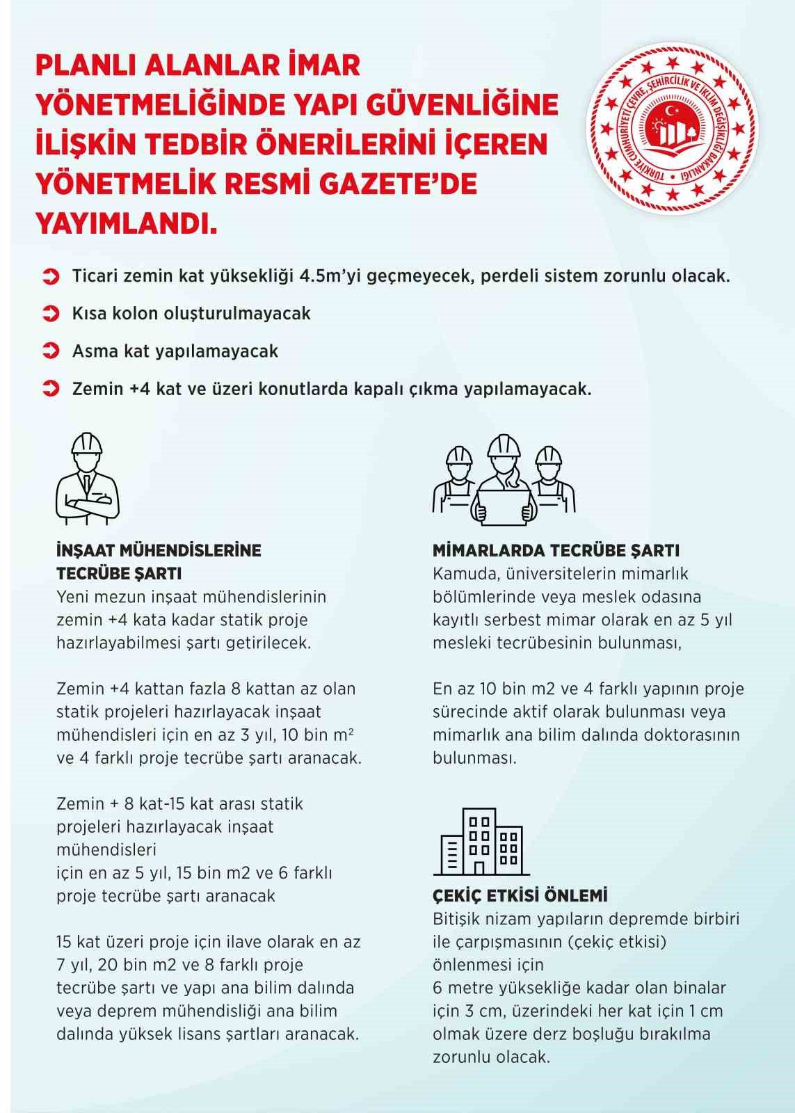 Türkiye genelinde yapılardaki sağlamlığı artırarak, can ve mal güvenliğini sağlamaya yönelik birtakım ilave tedbirler alınmasına ilişkin düzenlemeleri içeren Planlı Alanlar İmar Yönetmeliği’nde Değişiklik Yapılmasına Dair Yönetmelik, Resmî Gazete’de yayımlanarak yürürlüğe girdi.
