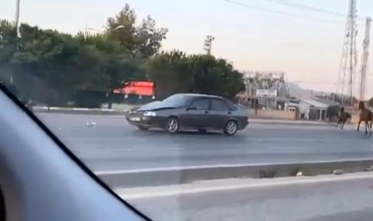 Bursa’da 11 Eylül Bulvarı, yakın çevre yolunda sahipsiz şekilde başıboş gezen atlar trafiği birbirine kattı. Ters şeritten dört nala koşan atlar, karşı yönden gelen araca çarptı. Sürücü ne olduğunu anlamadan aracın ön tarafı dağıldı. Yaşanan korku dolu anlar ise, saniye saniye bir vatandaş tarafından kaydedildi.