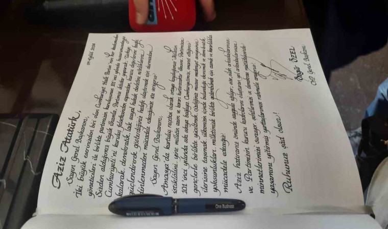 "Sayın Genel Başkanım, iki büyük eserinizden biri olan Cumhuriyet Halk Partisi’nin her kademesinden yöneticileri ile partimizin kuruluşunun 101’inci yılında huzurunuzdayız. Sizden aldığımız büyük ilhamla partimizi iktidar yaparak Türkiye Cumhuriyeti’ni kuruluş felsefesinden sapmadan kurucu değerlerine bağlı kalarak demokratik, laik, sosyal, hukuk devletini niteliklerini güçlendirerek gösterdiğiniz hedefe ulaştırmak için durmadan, dinlenmeden mücadele edeceğimize söz veriyoruz. Sayın Genel Başkanım, Amasya’da kurtuluş reçetesi olarak ortaya koyduğunuz ’Milletin istiklalini yine milletin azim ve kararı kurtaracaktır’ ilkesine partimizin 101’inci yılında sıkı sıkıya bağlıyız. Cumhuriyetimizi emanet ettiğiniz gençlerle birlikte yüceltmek, çizdiğiniz muasır medeniyet seviyesinin ilerisine taşımak, ülkemizin içerisinde bulunduğu ekonomik ve demokratik yoksunlukları milletimizle birlikte giderebilmek için azimle ve kararlılıkla mücadele edeceğiz. Aziz hatıranız önünde saygıyla eğiliyor, size, silah arkadaşlarınıza ve partimizin kurucu kadrolarını oluşturan yol arkadaşlarınıza minnetlerimizi sunuyor, şehitlerimizi ve demokrasi mücadelesinde yaşamını yitirmiş yurttaşlarımızı rahmetle anıyoruz."