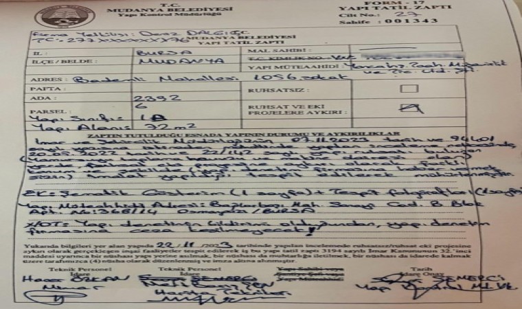 Cumhuriyet Halk Partisi (CHP) Mudanya Belediye Başkan Adayı Deniz Dalgıç’ın, Bademli’deki inşaatında, projeye aykırı olarak imalat yapıldığını ve ’kaçak yapı’ zaptının tutulduğu ortaya çıktı.